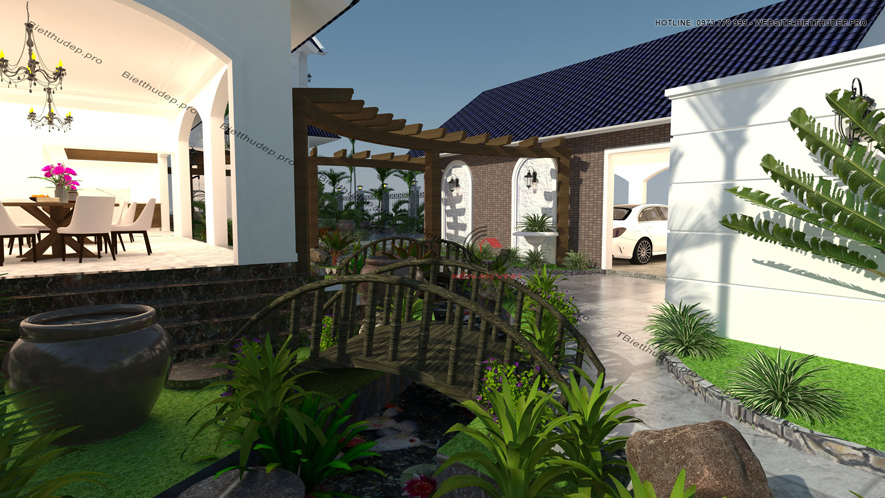 Không gian xanh với đa dạng cây cối, bố trí trải dài từ sân trước đến sân sau. Vừa giúp điều hòa không khí, tạo ra môi trường sống trong lành. Vừa tạo nên khu vực sinh hoạt, thư giản cho cả gia đình. Đồng thời làm tăng nét sinh động cho tổng thể không gian.